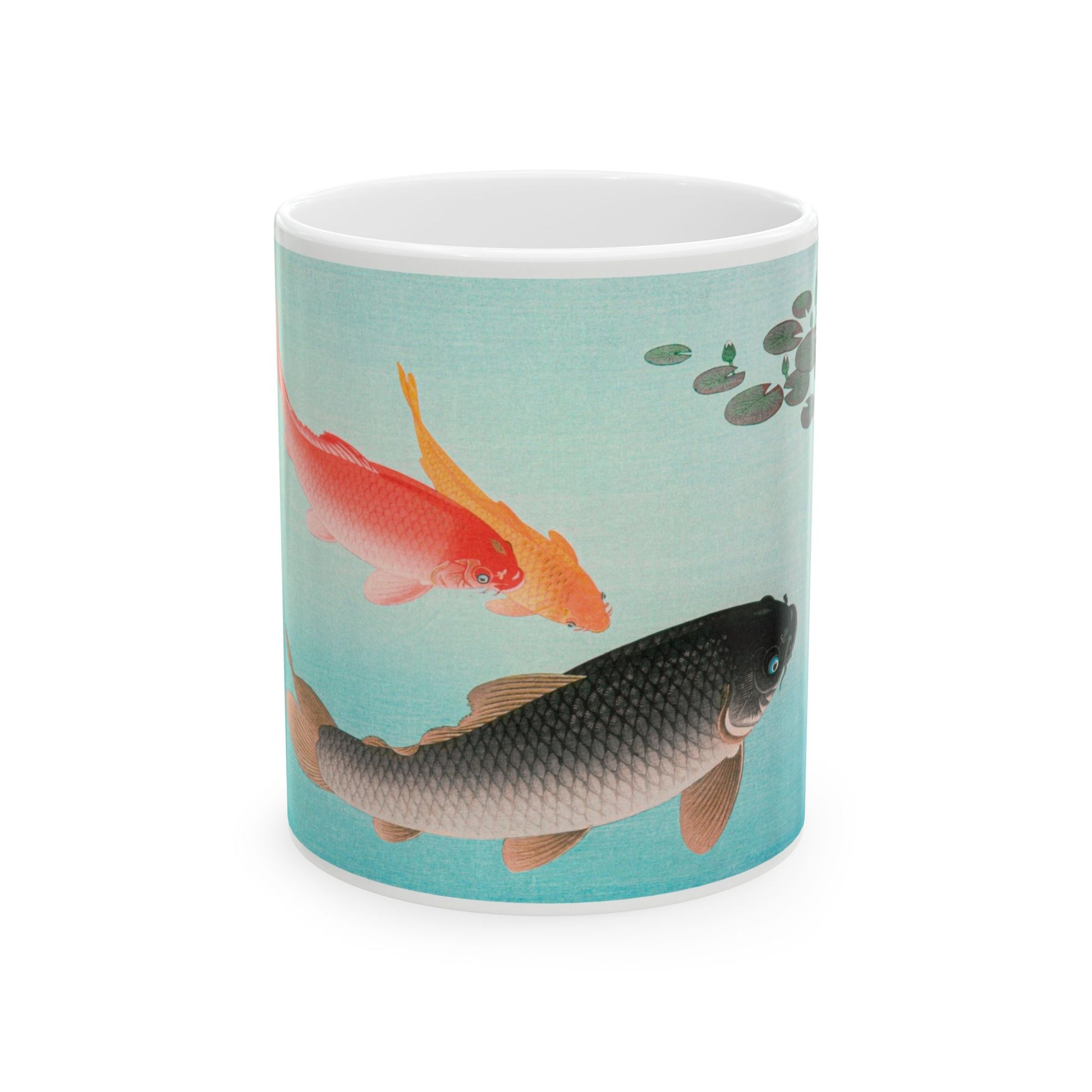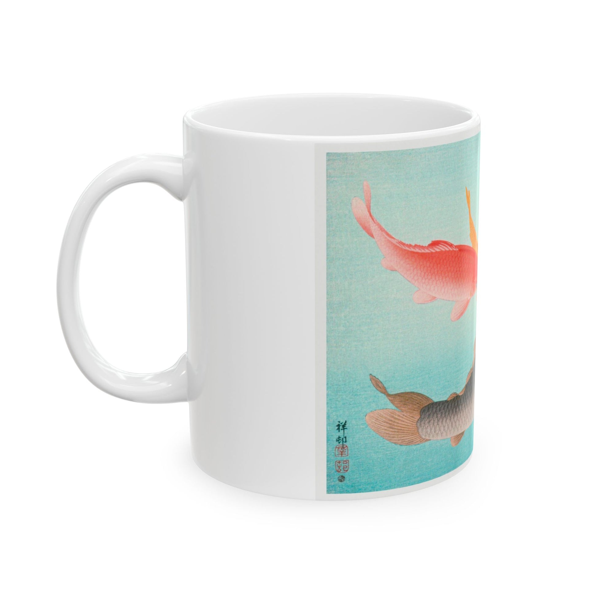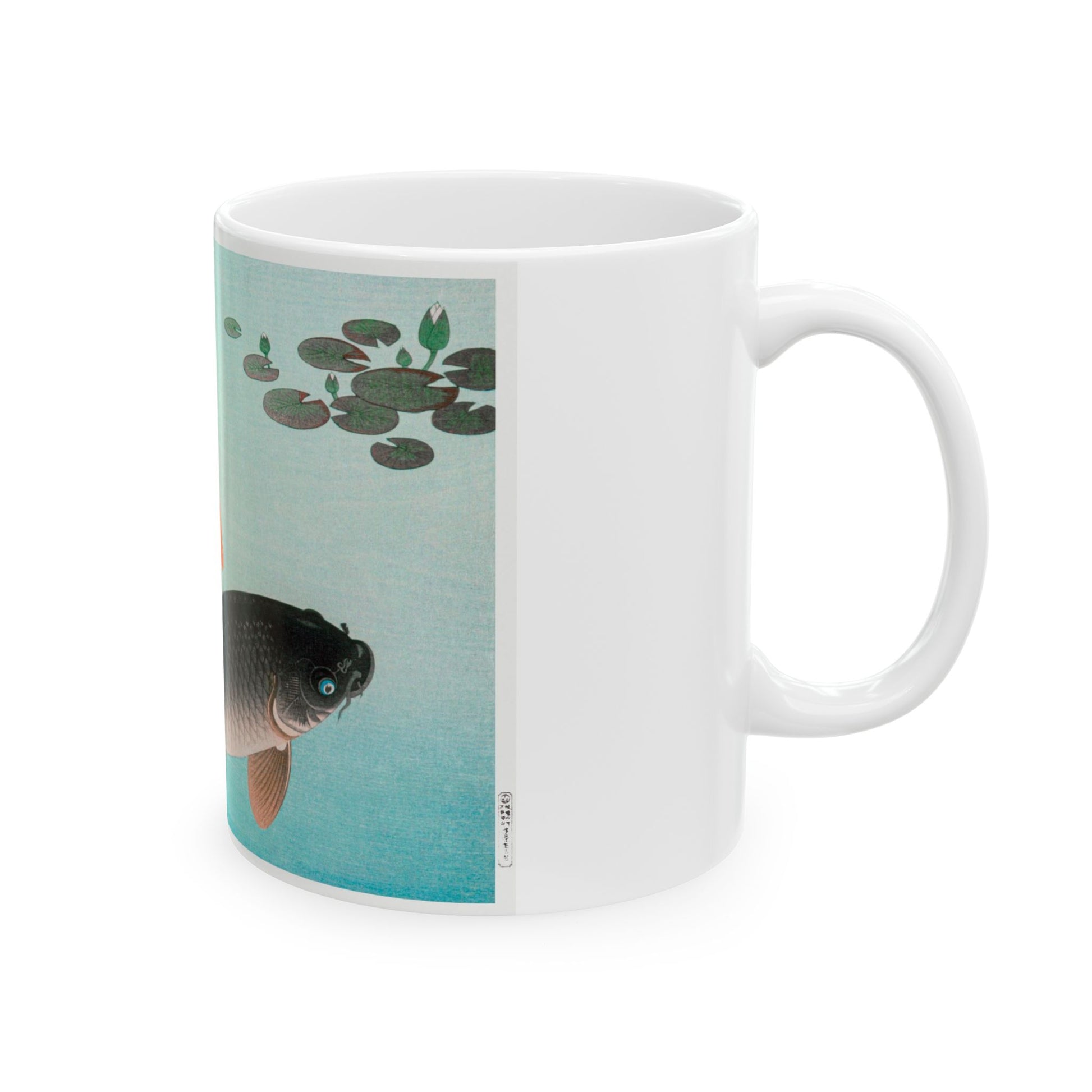 Japanese KOA fish ceramic coffee mug. It’s BPA and Lead-free, microwave & dishwasher-safe, and made of white, durable ceramic in an 11-ounce size. This is the perfect gift for coffee, tea, and chocolate lovers.